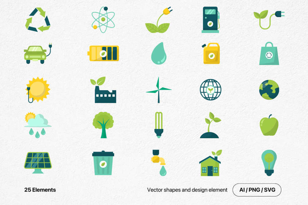 Give your designs a blast with these Eco Energy Illustrations! This collection comprises 25 illustrations of so many things related to eco-friendly and environmental sustainability elements. Everything you need for your project is here. All these elements are perfectly crafted for your projects. You can customize the colors and make a difference.